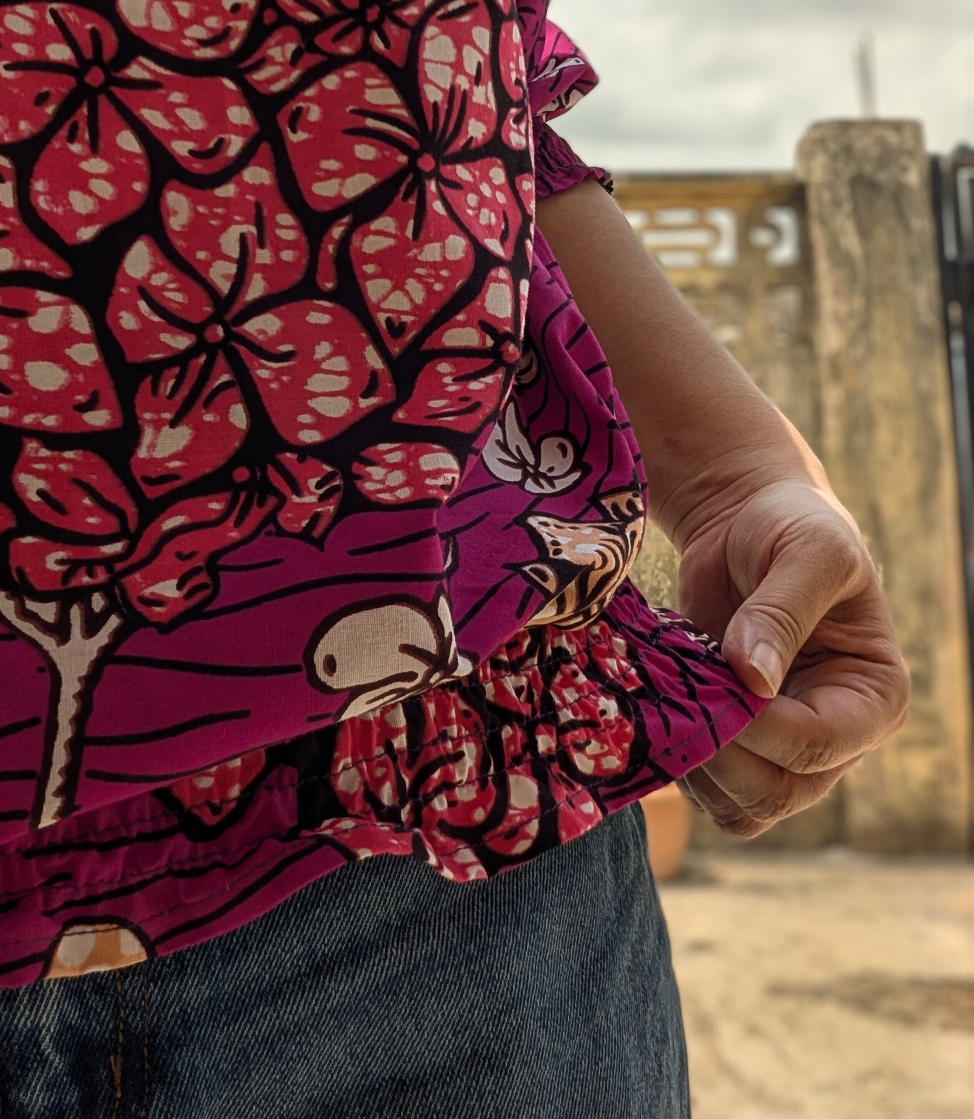 伸縮性のないアフリカンプリント生地にシャーリング加工を施すことで、ハイネックデザインでも快適に着られるブラウスが誕生しました。首元のフィット感が美しいシルエットを作り出し、華やかなカラーリングと相まって、顔まわりをパッと明るく演出します。六分丈の袖口とウエストにもシャーリングを施し、身体にやさしくフィットしながら、ふんわりとした女性らしいラインを生み出します。個性と着心地を両立した、存在感のある一枚です。