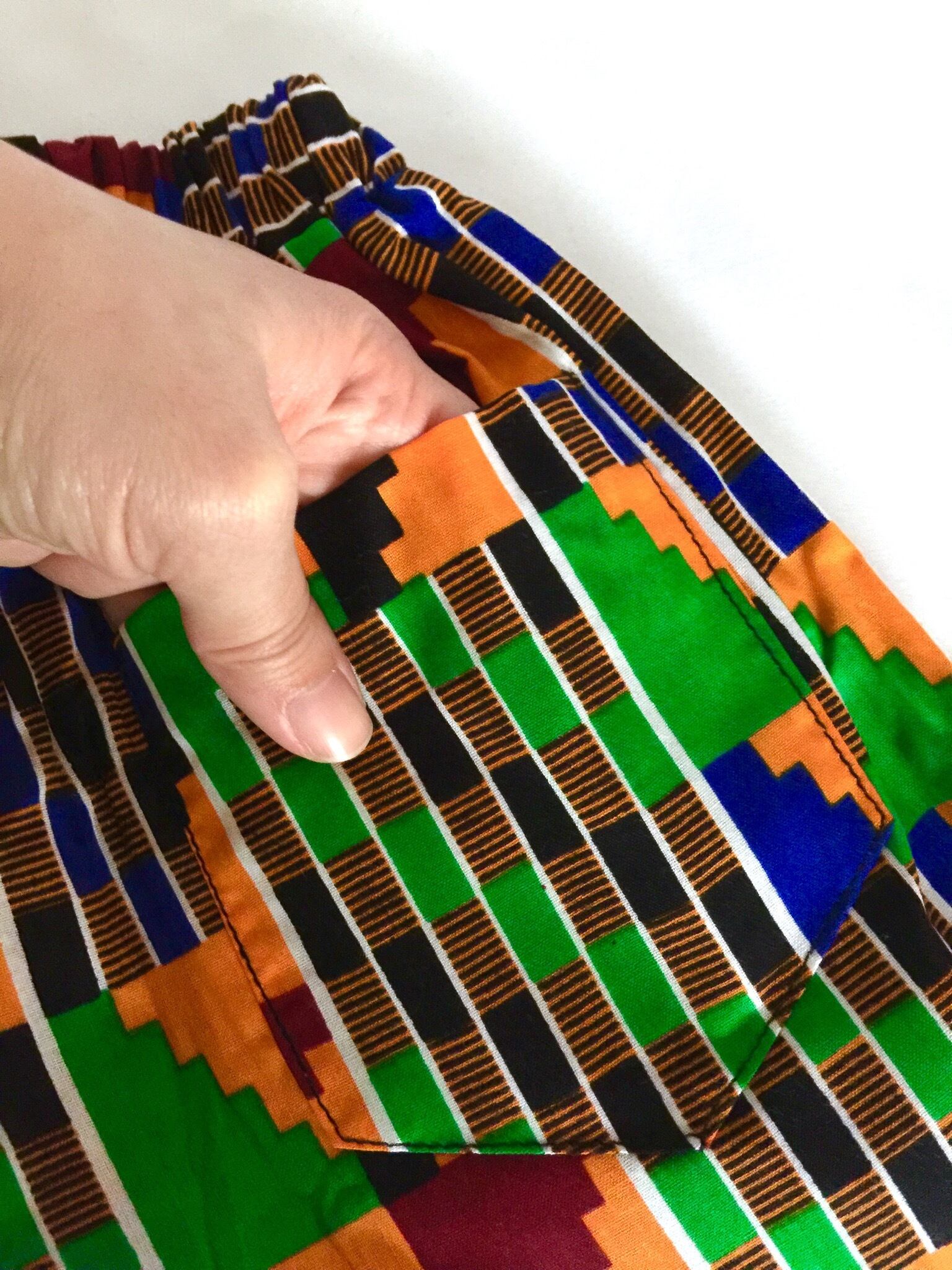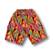 ガーナの布、「ケンテ」で楽チンウエストゴムのハーフパンツ。丈は膝下くらい。別売りのケンテシャツと合わせてセットアップとしても◎